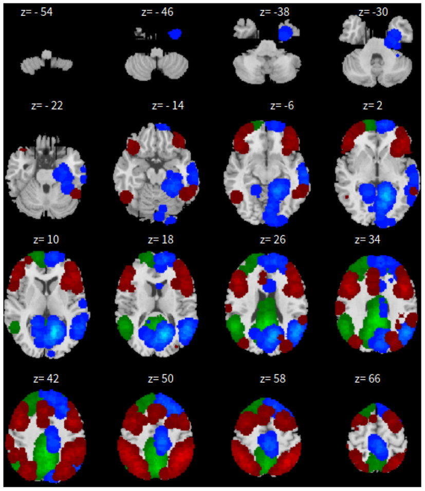 Functional connectivity is usually based on two approaches: task-based fMRI analysis and resting-state fMRI analysis. In general, task-based fMRI depends not only on the ability of the subjects to follow the task procedure, but also on the good design of the experiment, especially in clinical applications (Amaro and Barker, 2006; Daliri and Behroozi, 2014; Zhang et al., 2016). In contrast, resting functional magnetic resonance imaging can measure spontaneous fluctuations in the human brain and reflect the relationship among different networks (Biswal et al., 1995; Fox and Raichle, 2007). Therefore, rs-fMRI is applicable to situations in which task-related fMRI may provide insufficient information or sometimes fail to perform (Shimony et al., 2009). In resting state the brain is still constantly active and parts of the brain are connected by its intrinsic connections, and some connections even show a stronger relationship when doing certain tasks. Therefore, it is more reasonable to use resting state to study basic functional connections, especially to identify intrinsic connectivity networks or resting state networks (RSNs) (Greicius et al., 2003; Beckmann et al., 2005; De Luca et al., 2006; Seeley et al., 2007; Canario et al., 2021; Morris et al., 2022). As mentioned in several studies (Beckmann et al., 2005; De Luca et al., 2006; Fox and Raichle, 2007; Smith et al., 2009; Cole et al., 2010), RSNs are located in the gray matter regions of the human brain, these RSNs reflect the core perceptual and cognitive processes of functional brain systems.
