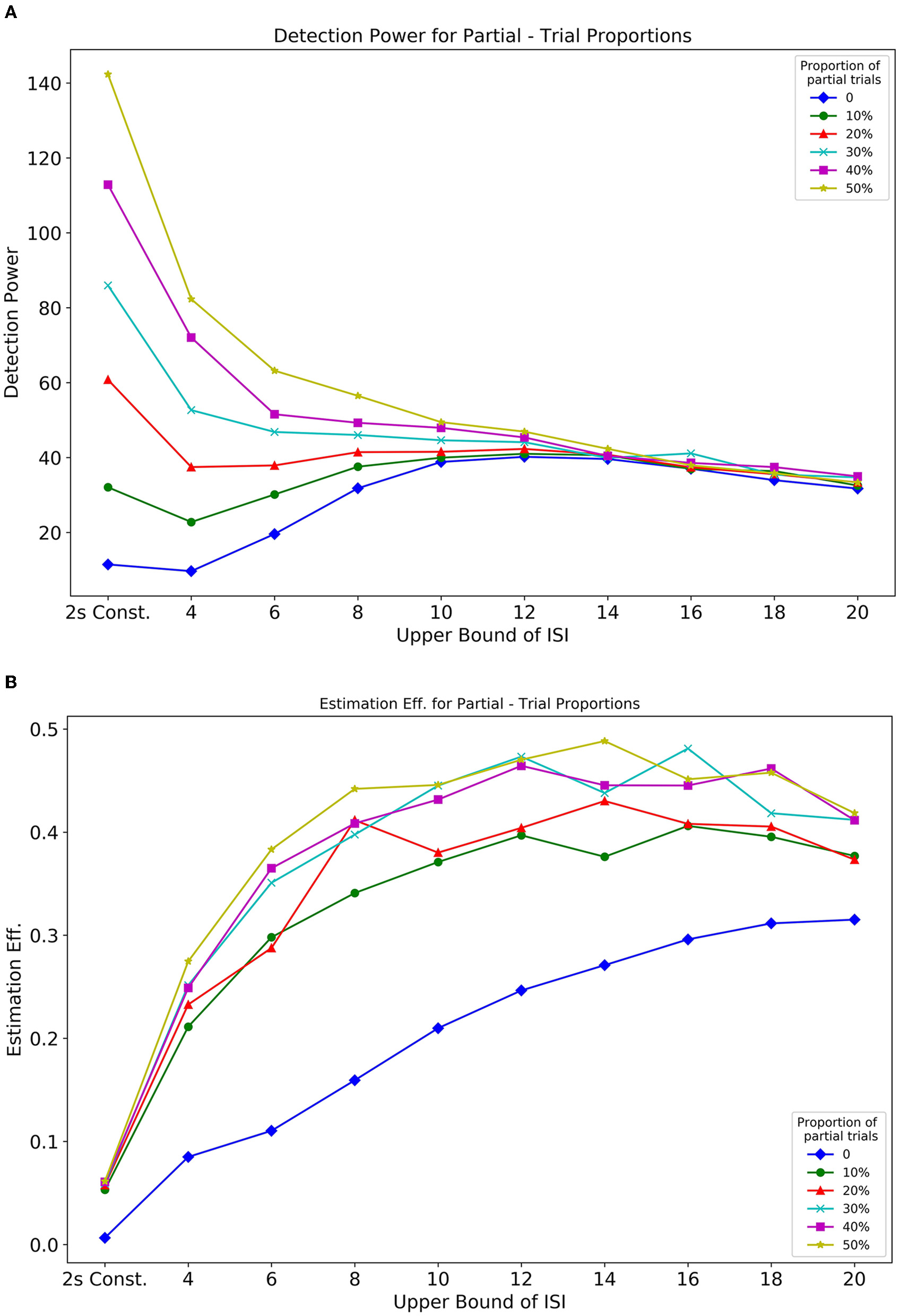 The estimation efficiency measures, shown in Figure 10B, depict an asymptotic relationship between efficiency and ISI bounds for all proportions of included partial trials. It can also be seen that there is a benefit even with only 10% partial trials included in the design sequence, compared to having no partial trials. These findings were further extended and corroborated by running different simulations that considered greater fixed LISI (Supplementary Figures 7, 8).