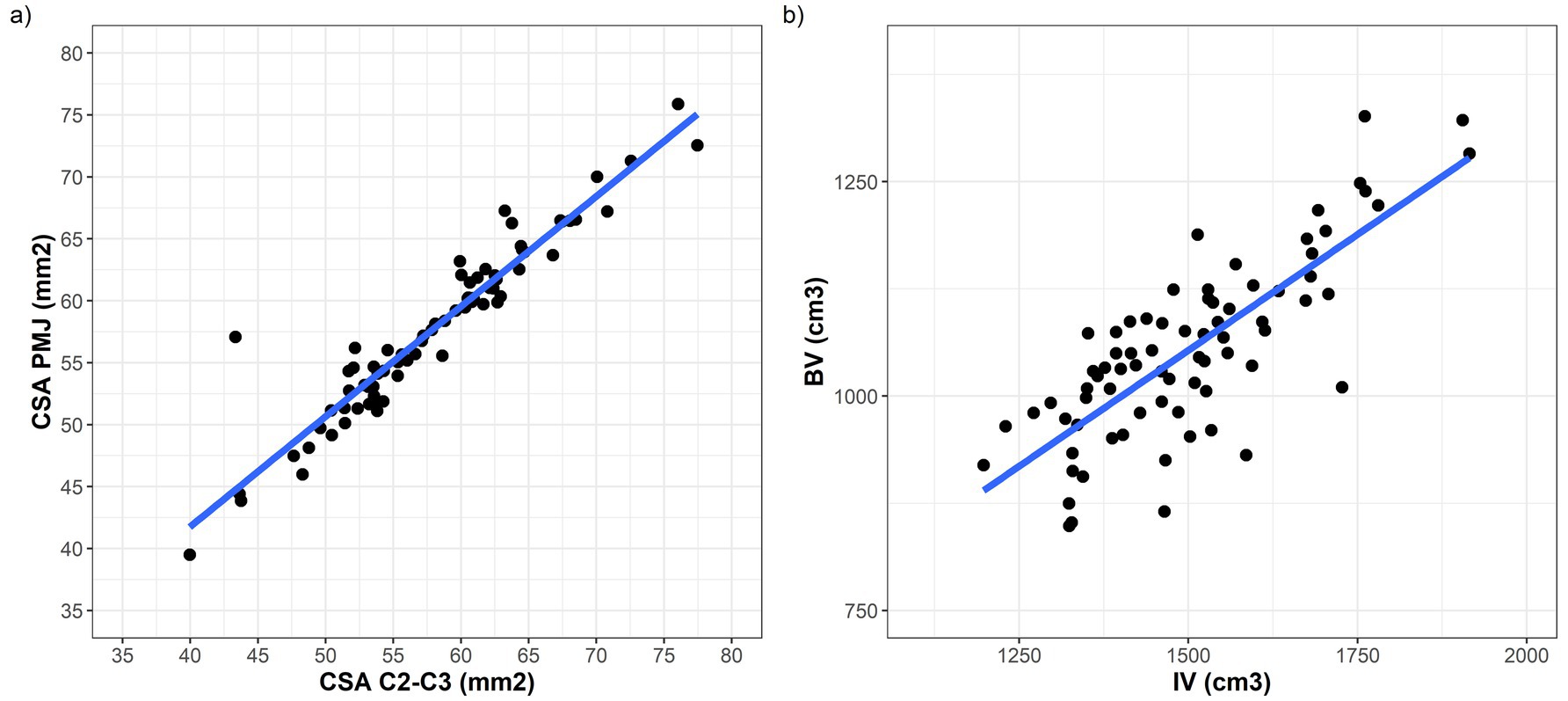 Scatter plots in two panels. Panel a: CSA PMJ (in square millimeters) versus CSA C2-C3 (in square millimeters) with a positive trendline. Panel b: BV (in cubic centimeters) versus IV (in cubic centimeters) also showing a positive trendline. Black data points and blue trendlines are present in both plots.