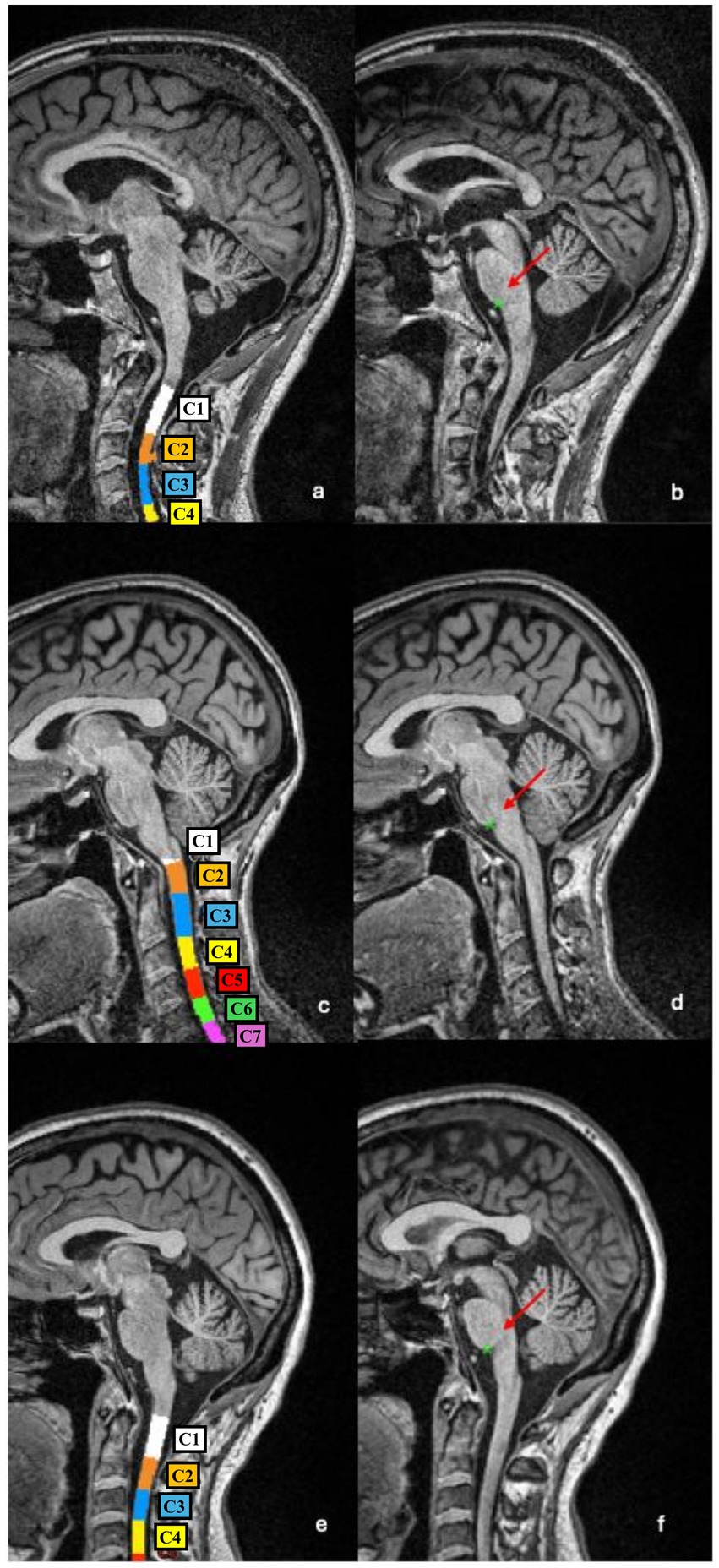Six-panel MRI images of the cervical spine and brain. Panels a, c, and e highlight color-coded cervical segments. Panels b, d, and f show red arrows pointing to the pontomedullary junction (PMJ). Each panel documents different levels of spinal and brain anatomy.