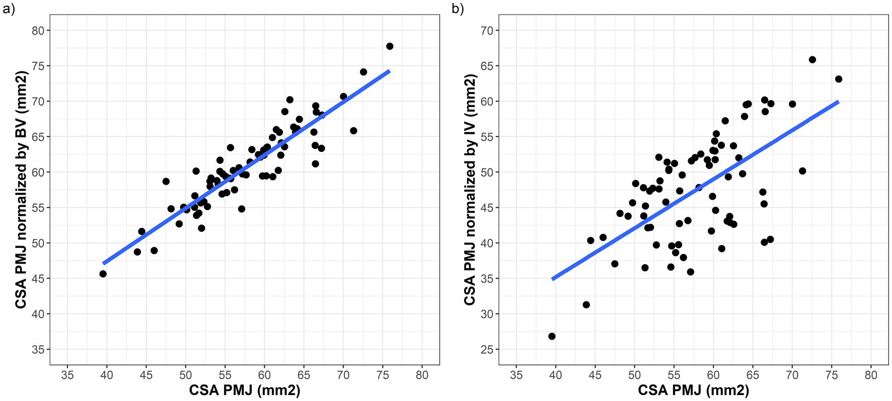 Figure 3. Scatter plots showing the correlation between raw CSA PMJ on the x axis and CSA PMJ measurements normalized by BV (a) and IV (b).