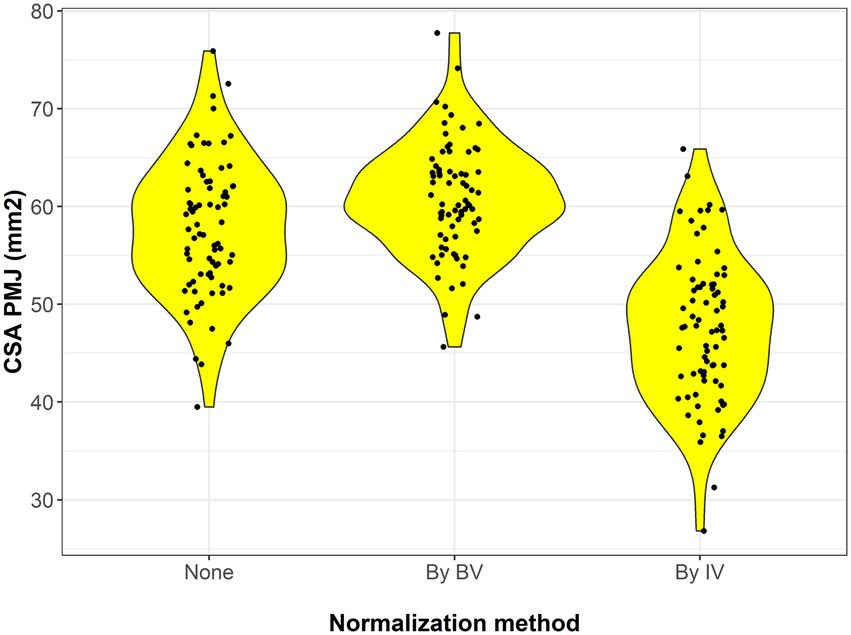 Both normalization methods produced CSA PMJ measurements that were highly correlated with raw CSA PMJ (normalized by BV: Pearson’s rho = 0.91, 95% CI = 0.86–0.94, p < 0.001; normalized by IV: Pearson’s rho = 0.64, 95% CI = 0.48–0.75, p < 0.001; Figure 3). However, normalization of CSA PMJ had a substantial impact on both the magnitude and distribution of the measurements, especially when normalized by IV (Figure 4). As compared to raw CSA PMJ, the CSA PMJ normalized by BV was increased by a median of 3.2 (1.9–4.7) mm2, whereas the CSA PMJ normalized by IV was decreased by a median of −8.4 (−14.4 to −5.4) mm2 (Supplementary Table S1).