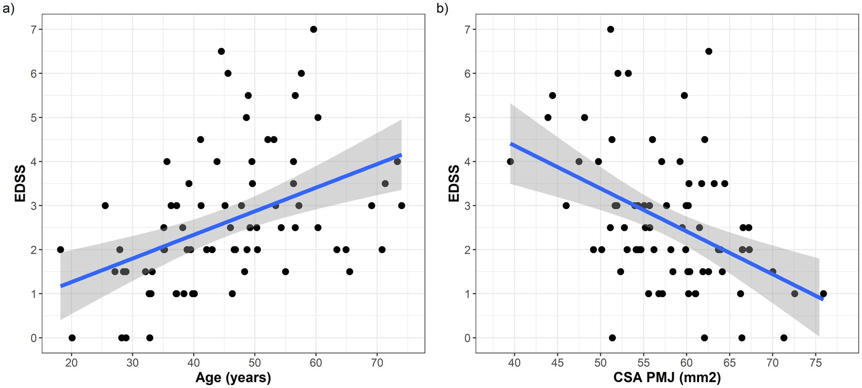 Scatter plots show relationships between EDSS and two variables. Plot a) depicts a positive correlation between age in years and EDSS. Plot b) shows a negative correlation between CSA PMJ in square millimeters and EDSS. Blue trend lines with shaded confidence intervals indicate correlation trends.