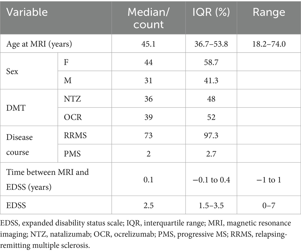 A total of 75 MS patients were included in the study (Table 1). The median age at the time of MRI acquisition was 45.1 (36.7–53.8) years, and 44 patients were female (58.7%). Thirty-six (48%) patients were on treatment with NTZ, 39 (52%) with OCR. Only two patients had progressive MS. Median EDSS was 2.5 (1.5–3.5), with scores ranging between 0 and 7.