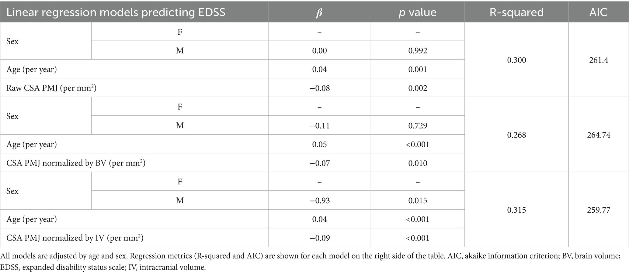 Table 2. Multivariate linear regression models testing the association between CSA PMJ (raw, normalized by BV and by IV) with EDSS scores.