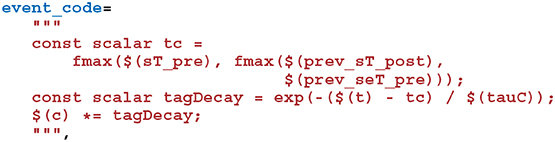Finally, we define the “learn post code” which is called whenever a postsynaptic spike arrives at the synapse. Other than implementing the potentiation case of Equation (9) and using the current presynaptic spike time when calculating the time since the last update of Cij—in order to correctly handle presynaptic updates made in the same timestep—this code is very similar to the sim code:
