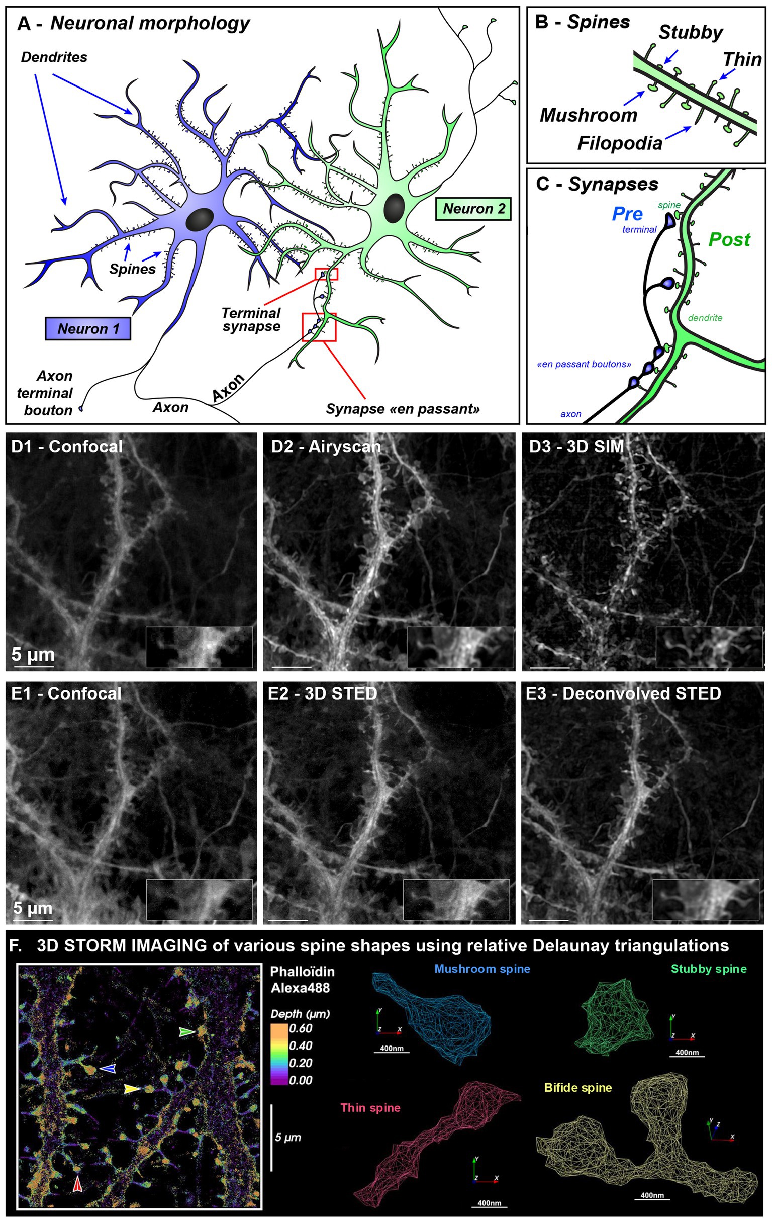 Figure 1. Neuronal and spine morphologies revealed using various microscopy modalities illustrating resolution gain needed for spine imaging. (A–C) Morphology of communication between two neurons (A). A neuron is made up of a cell body, an axon, and several dendrites. The axon can divide in collaterals branches that can contact several other neurons and release neurotransmitter at synaptic sites. Synapses are dedicated contact sites between soma or dendrites that receives information from neighboring axons. Synapse can be present at the very end of the axon (at the presynaptic terminal) or can establish “contact en passant” along the axon. On the dendrite, the synaptic zone is called post-synaptic. Blue Neuron is sending information via his axon and green neuron is receiving information on different dendritic spines (B) leading to the formation of synapses (C). (D,E) Correlative images of hippocampal neurons after 21 days in vitro labeled with MemBright Cy3.5 probe (D1–D3) were acquired on Zeiss Elyra PS1 equipped with Airyscan and SIM allowing correlative images of various microscopy modalities while (E1–E3) were imaged on Leica confocal STED 3DX. The same sample and region was used for both (D,E). The inset display a magnified portion of the dendrite harboring one thin (left) and mushroom spine (right). Deconvolution was done using Classic Maximum Likelihood Estimation in Huygens software. Scale bar: 5 μm. (F) 3D STORM imaging of dendritic spines class was done using Alexa488-Phalloidin that labels spine heads and neck. All STORM localizations, were pooled and external envelope was reconstructed using Delauney triangulation. In contrast to membrane labeling, here spine head is underestimated since actin is not filling all spine head volume especially close to the PSD. Various spine types are shown with colored arrows. Stubby spine (with no neck) is in green, mushroom spine (with short neck and big head) is in blue, thin spine (with long neck and small head) is in red, and a bifid spine is in yellow.