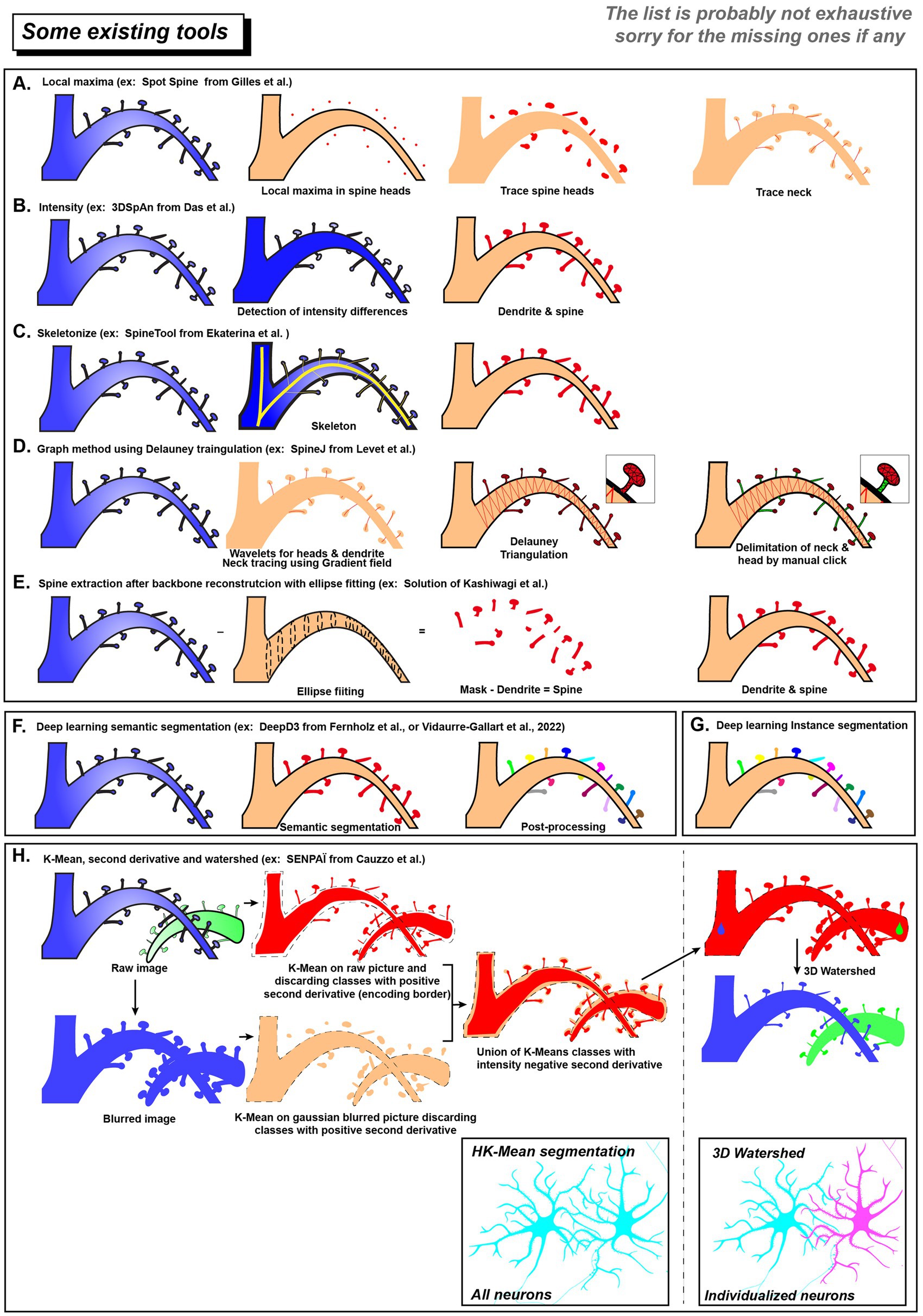 Figure 2. List of existing tool for spines and neurons segmentation. Schematic overview of dendritic spines segmentations using different ruled based approaches (A–E) or data driven modalities (F–H). Deep learning methods can use semantic segmentation (F) or instance segmentation (G). (H) SENPAÏ Tool for neuron and spine segmentation is using both ruled based and data driven approaches. In the end, neurons in a dense population will be segmented as an individual cell (blue and magenta).