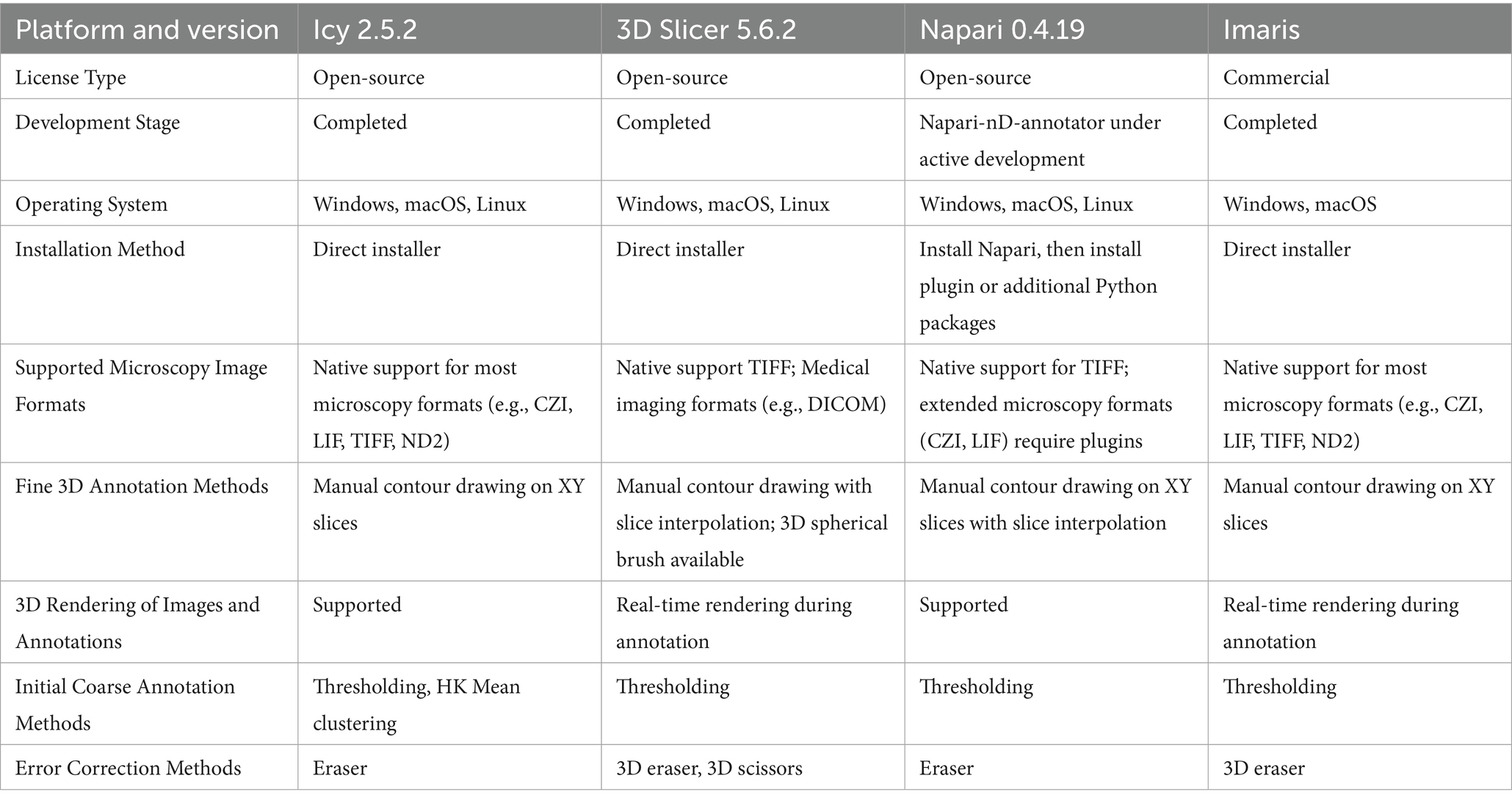 Several bioimage analysis platforms with 3D annotation capabilities have been developed, each offering distinct advantages, as exemplified in Table 1.