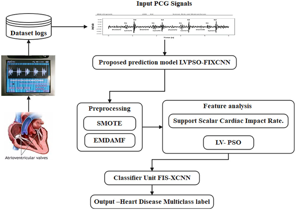 A promising method for classifying heart sounds involves analyzing recordings of sounds created by the heart during each cardiac cycle using PCG signals. Figure 1 describes the Working Principle of PCG Signal Observation and Processing. These signals contain valuable information about heart function and can be analyzed using DL techniques to identify patterns associated with different heart states (Waaler et al., 2023). In this paper, we present future work to improve the classification of heart diseases by utilizing a combination of Linear Vector Particle Swarm Optimization (LVPSO) and Xception Convolutional Neural Networks (XCNN). In the first step, the PCG signal can be pre-processed using the proposed methods to extract the relevant features for classification. This includes techniques such as signal elimination, segmentation, and feature extraction to improve data quality and reduce noise and artifacts that can interfere with classification. Once the data is pre-processed, it can be input into the LVPSO algorithm. The LVPSO algorithm is a variation of the traditional particle swarm optimization algorithm designed for linear vector optimization problems.