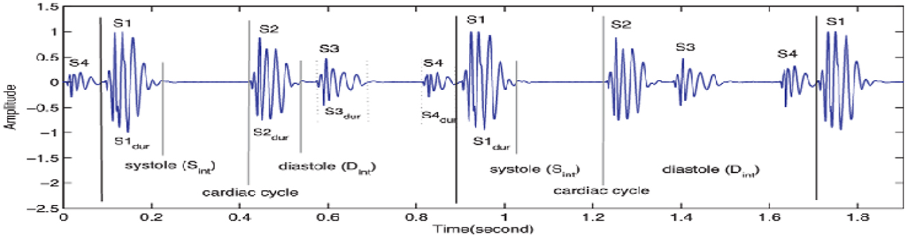 Two additional heart sounds, S3 and S4, may indicate abnormal heart activity. The timing and intensity of cardiac PCG signals provide valuable information on the cardiac cycle. The heart sounds S1 to S2 are called the systolic interval, indicating the ventricular contraction and ejection length. The intensity of heart sounds may fluctuate due to factors like ventricular contraction and valve abnormalities. Changes in timing and intensity can indicate conditions such as heart failure or valvular stenosis.