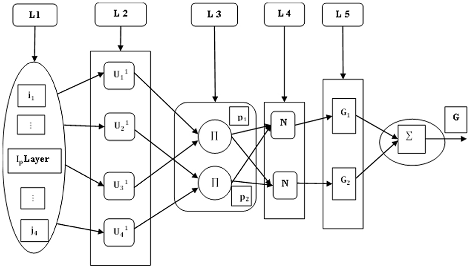 The input signal is amplified, and the output is sent via a straightforward amplifier with a set production. The output can be assessed by building the firing output of the product layer rule given in Equation 39. Let's assume the px− weight of the fuzzy rule.