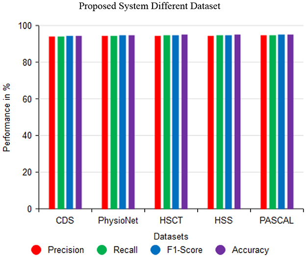 As indicated in Figure 9, the proposed XCNN method can accurately predict the cardiac sound PCG signals using datasets such as Circor Digi scope, Physico-Net Challenge, HSCT, HSS, and PASCAL. Moreover, the PCG signal performance-based assessment of precision, recall, F1 score, and precision can accurately predict heart sound predictions. Then, Circor DigiScope-94.49%, Physico-Net Challenge-94.85%, HSCT-94.91%, HSS-95.01, and PASCAL-95.08% improved the accuracy of each performance measure on the heart sound data. Thus, by assessing the PCG signal's efficacy on cardiac sounds, the accuracy of these has been improved.