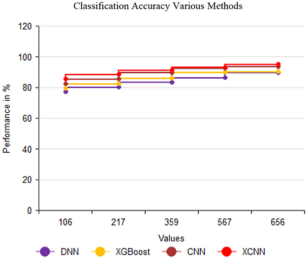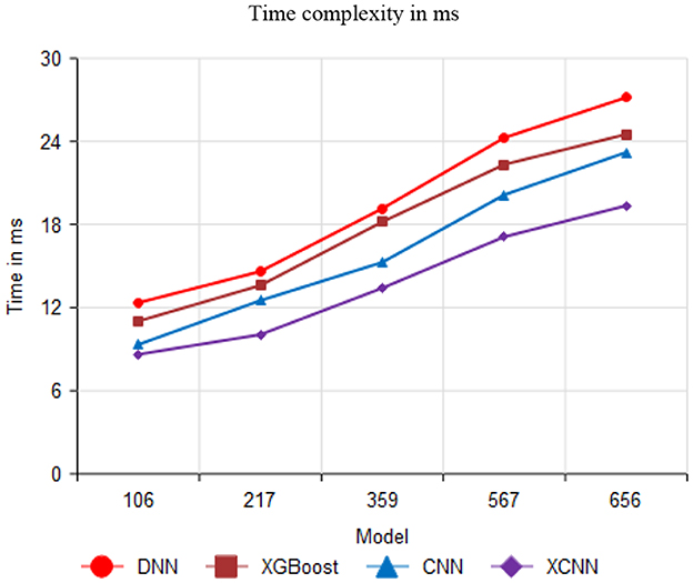 Figure 11 compares time complexity performance with 106, 217, 359, 567, and 656 values. The proposed method attains 19.36 ms for 656 values; similarly, the existing method attained 27.17 ms, 24.51 ms, and 23.21 ms for DNN, XGBoost, and CNN, respectively.