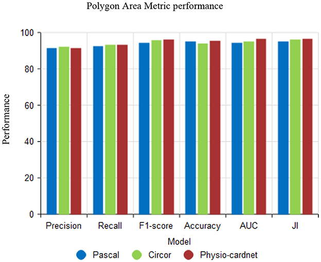 Figure 12 shows the Polygon Area Metric (PAM) performance using the proposed XCNN method. In the analysis, PAM is user metrics are precision, recall, F1-score, accuracy, AUC and Jaccard Index (JI). The proposed method attains better results using various datasets like Pascal, circor and physio-cardnet.