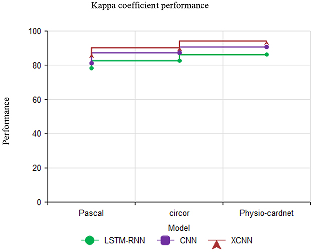 Figure 13 describes the Kappa coefficient performance with various datasets like pascal, circor and physio-cardnet. The kappa coefficient estimate the agreement among classification and truth values in the dataset. The proposed method obtains the high kappa coefficient performance than other methods.