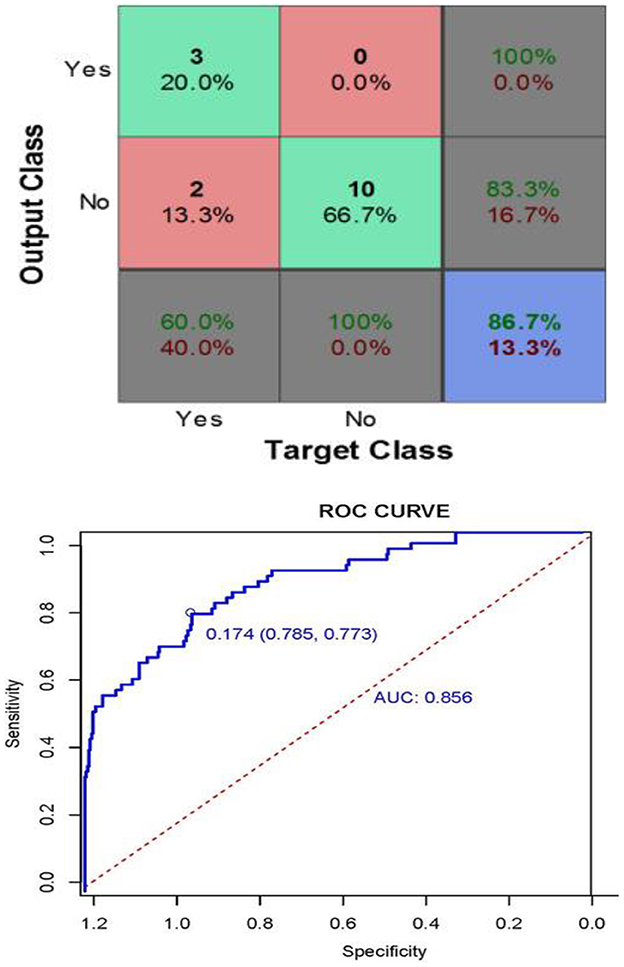 Figure 14 defined as, This matrix describes the performance of the neural network model in terms of target class and output class values. The Curve Analysis (CA) for the model revealed that when the threshold probability of an individual was between 20% and 95%, application of this model to predict the heart disease prediction analyzing the AUC values of 0.856 [95% CI: 0.804, 0.908; P < 0.001]. The results showed that the test p = 0.098. According to the maximum principle of the index, the optimal cut-off value of AUC was 0.174, in which the accuracy was 77.3% and the sensitivity was 78.5%, indicating that the model had a good fit and a good fit with the data (Figure 13). After 2,000 recordings resampling iterations, the AUC was 0.852, showing that the model had good ability.