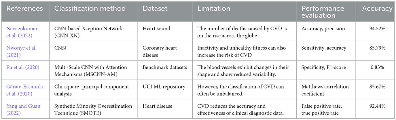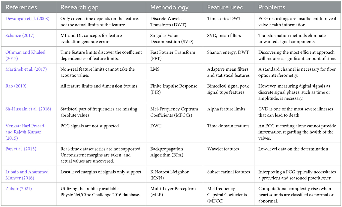 Some effective models can classify PCG signals using Attention-Based Bidirectional LSTM (A-BLSTM) techniques (Prabhakar and Won, 2023). Another study used (Sivakami and Prabhu, 2023) Cuckoo Search Bio-inspired Algorithm (CSBA) with DBN method for heart disease prediction. Similarly, the novel Muthulakshmi and Parveen (2023) developed a Z-score normalization, African Buffalo Optimization (ABO) methods for effective disease prediction. Study Taylan et al. (2023) concentrated on classification of cardiovascular disease with the help of support vector regression (SVR) and ANFIS algorithm. Similarly, the article Thakkar and Agrawal (2023) used a deep CNN and min-max normalization method. The novel Yusuf Ilu and Prasad (2023) introduced an autoregressive integrated moving average (ARIMA) and K-means Clustering methods for disease identification. The literature review indicates a rising interest in applying DL techniques for predicting cardiac disease based on audio signals. Various studies reviewed in this research have demonstrated the efficiency of DL models such as CNN, LSTM, and RNN in accurately predicting cardiac disease from audio signals. Besides, investigating transfer learning and hybrid models exhibits potential for further advancement in this field. In conclusion, exploring heart disease predictions through DL techniques using sound signals holds great promise in improving early detection. Through employing the capabilities of DL, researchers can create precise and effective predictive models that have the potential to save lives.