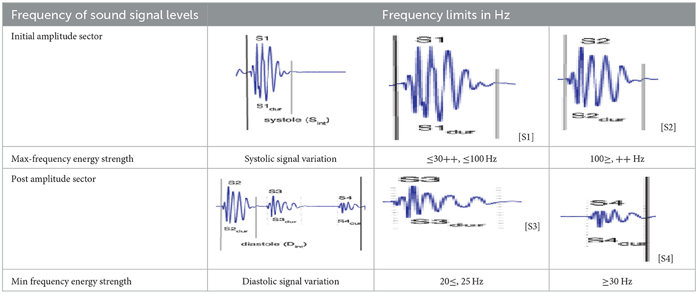 The heart PCG signals consist of several frequency components corresponding to different cardiac cycle physiological events, as indicated in Figure 3. The frequency range of cardiac sound waves is displayed in Table 3. The closure of the tricuspid and mitral valves produces the first heart sound (S1), which has low-frequency features. The closure of the aortic and pulmonary valves results in the second heart sound (S2), which has a higher frequency component.