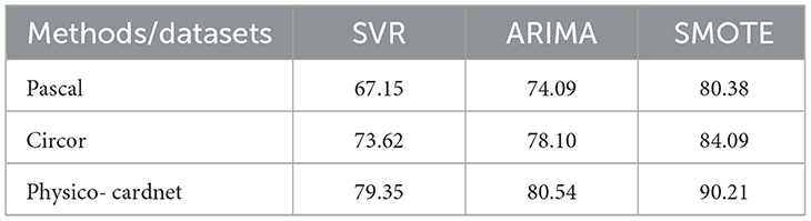 Table 4 compares the performance of different variation methods like Support Vector Regression (SVR) and Autoregressive Integrated Moving Average (ARIMA). The proposed method attains 80.98%, 84.09%, and 90.21% for Pascal, Circor and Physico-cardnet, respectively.