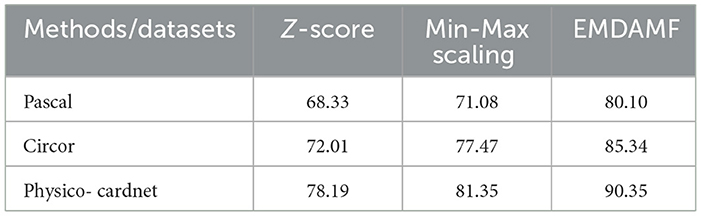 Table 5 compares the performance of various pre-processing methods with diverse PCG datasets such as Pascal, Circor, and Physico- cardnet. The proposed EMDAMF method achieved 80.10% for Pascal, 85.34% for Circor, and 90.35% for the Physico-cardnet dataset. In contrast, existing filters failed to achieve high performance compared to the proposed method.