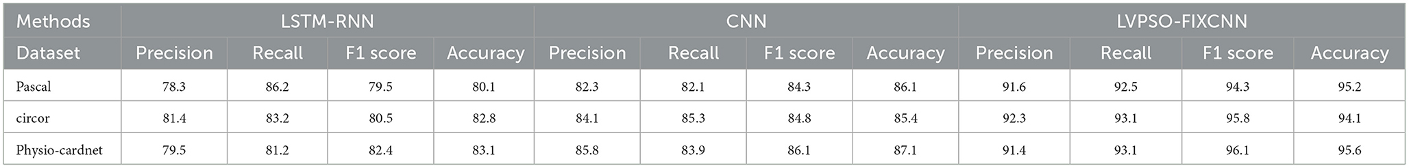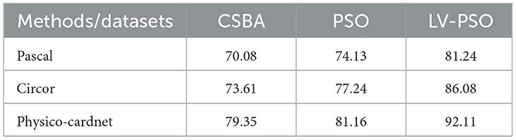 Table 8 compares the performance of different feature selection methods and various PCG datasets. The proposed LV-PSO method yield is 81.24%, 86.085%, and 92.11% for Pascal, Circor and Physico-cardnet datasets, respectively. Similarly, the existing methods are Cuckoo Search Bio-inspired Algorithm (CSBA) and Particle Swarm Optimization (PSO) obtained less outcome performance than the proposed system.