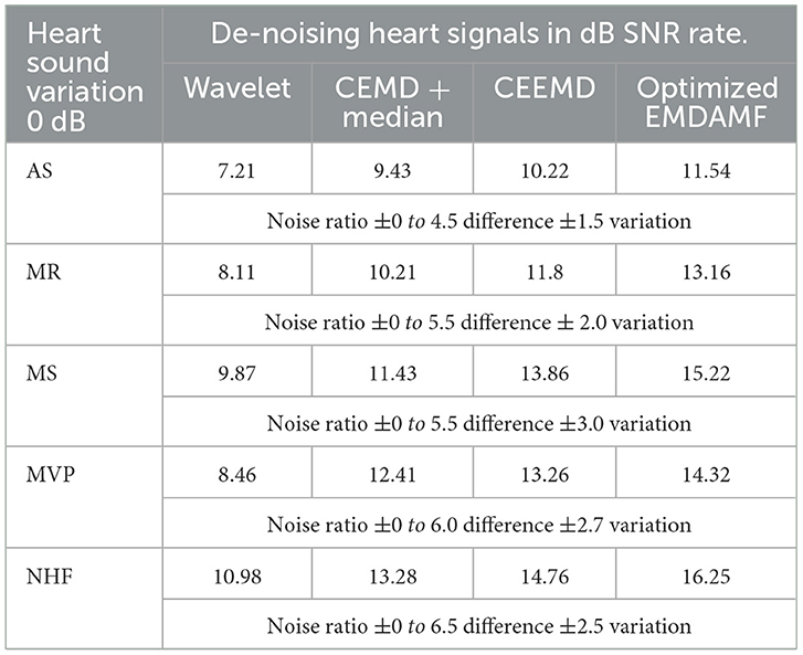A filter enables the PCG signal's decibel ratio based on heart sound variation for feature estimation as shown in Table 9. The empirical methods of signal analysis, using different dB levels to indicate signal types in PCG heart sounds, estimate the optimal accuracy of EMDAMF for disease type approximation. Various methods were employed to assess the accuracy prediction in analyzing AS heart sound variability within the PCG signal. The thorough evaluation included the SNR of de-noising heart signal wavelet rate −7.21, CEMD + median −9.43, and CEEMD −10.22. The AS heart disease category achieves an accuracy signal-to-noise ratio estimate of 11.54 in the EMDAMF approach. Similarly, heart diseases like MR, MS, MVP, and NHF did not yield precise ratios using the methods above. However, the EMDAMF model indicated higher accuracy ratios of 13.16, 15.22, 14.32, and 16.25 for heart conditions such as MR, MS, MVP, and NHF, respectively. This suggests the potential efficacy of the EMDAMF model in diagnosing specific heart sounds.