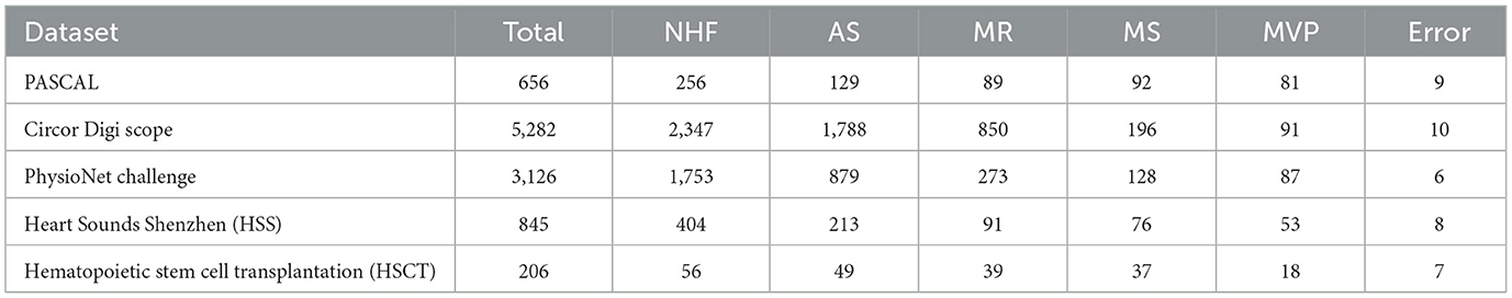As illustrated in Table 10, using datasets like PASCAL, Circor Digi scope, Physio Net Challenge, HSS, and HSCT dataset, sourced from various datasets, can yield precise estimations. Additionally, the total count of recordings of these sounds within each dataset is delineated, for instance, PASCAL-656, Circor Digi scope-5282, Physio Net Challenge-3126, HSS-845, MVP-206, and so forth. Furthermore, cardiac recordings can be used to identify features such as NHF, AS, MR, MS, MVP, and errors, which can be used to predict the overall accuracy of the dataset.