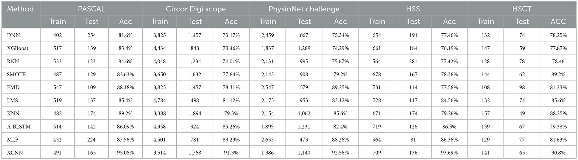 The XCNN met hod demonstrates the capability to accurately predict the performance of cardiac sound PCG signals using datasets illustrated in Figure 10 and Table 12. This has significant practical implications, as it outperforms previous methodologies employing DNN, CN N, and XGBoost for heart sound accuracy detection. The manipulated versions of DNN, CNN, and XGBoost exhibited enhanced accuracies of 89.78%, 90.23%, and 93.69%, respectively. However, the XCNN method achieved the highest accuracy rate of 95.08%, establish ing itself as a promising method for precise heart sound analysis and offering new possibilities for healthcare technology.