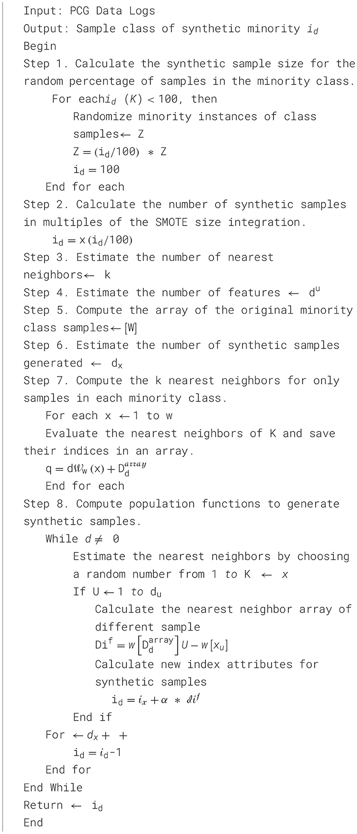 Creating synthetic data from minority classes of random number data can be achieved by calculating population functions. Furthermore, nearest neighbors provide new index array features for different samples, as detailed in Algorithm 1. Let's assume the id-number of the synthetic sample, Z-Minority instance, K-nearest neighbor, x- integral sample, du−number of the attribute, W-sample, q−populate, Ww−synthetic sample, Dd−nearest neighbor, dx−new index, xu−attribute index, α−random number.