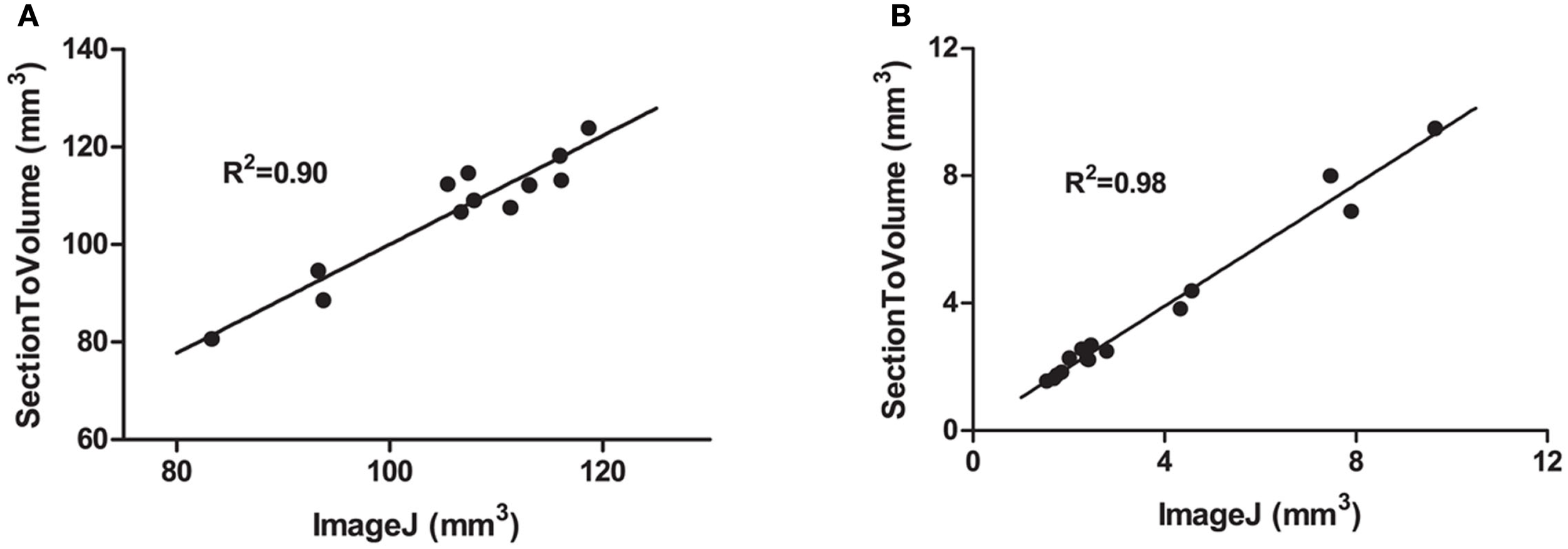 Comparisons between measurements made in ImageJ and SectionToVolume. (A) The hemispheric tissue volume between bregma 0 and bregma −4.5 after focal TBI in the mouse. (B) The volume of the ventricles of both sham- and brain-injured animals in addition to values of the cortical cavity of brain-injured animals. For all measurements, values obtained with the SectionToVolume were highly correlated with ImageJ data.