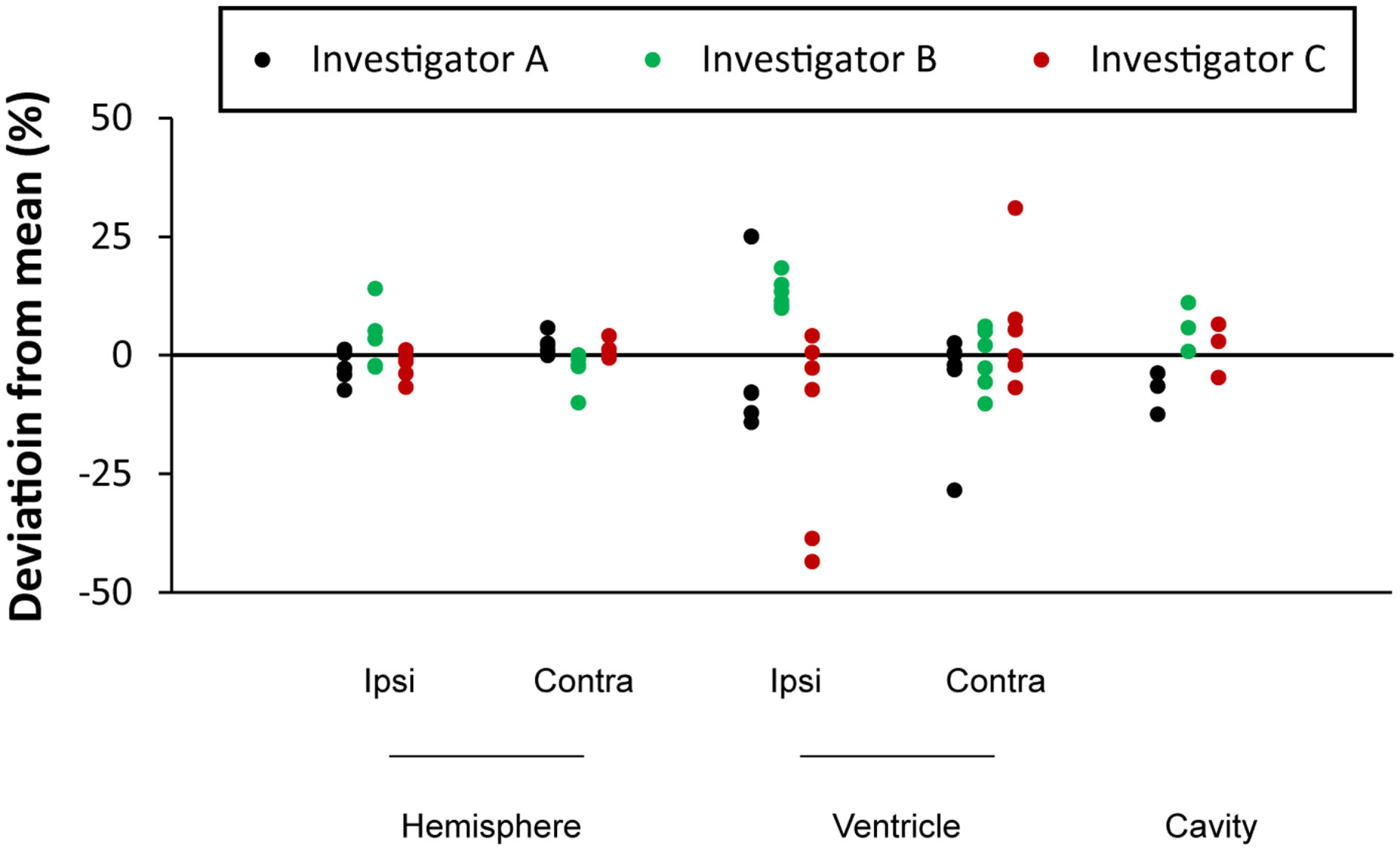 The measurements from three investigators using SectionToVolume for all sections showed a high inter-rater reliability (Cronbach’s alpha was 0.998 and the intraclass correlation was 0.995; deviation from the mean of each researcher is shown in Figure 3). The ipsilateral ventricle showed the largest variability between investigators.