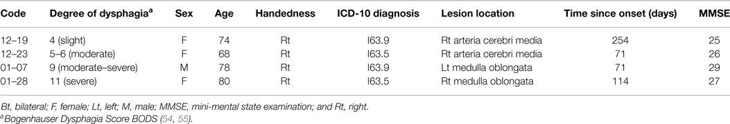 Selection of patients was based on the following criteria: in the first step and with the prior consent of the attending medical doctors or therapists, neurological patients who showed severe impairments in swallowing, with any site of brain lesion and motor deficit and with a time laps from the event of at least 4 weeks, were invited to participate in this investigation. Further inclusion and exclusion criteria are listed in Table 2.