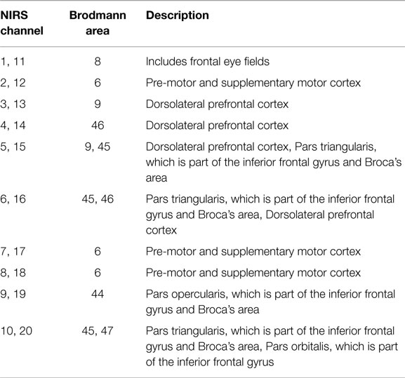 The MNI coordinates of the NIRS channels were assessed using ELPOS (zebris Medical GmbH), a system to determine 3D coordinates of EEG/NIRS electrode/optode positions with high accuracy based on the run time measurement of ultrasonic pulses. Afterwards, a coordinate-based system was used to retrieve brain labels from the 1988 Talairach Atlas, called the Talairach Daemon (58, 59). In Table 3, the anatomic labeling (Brodmann areas, Talairach Daemon) are listed for each NIRS channel.