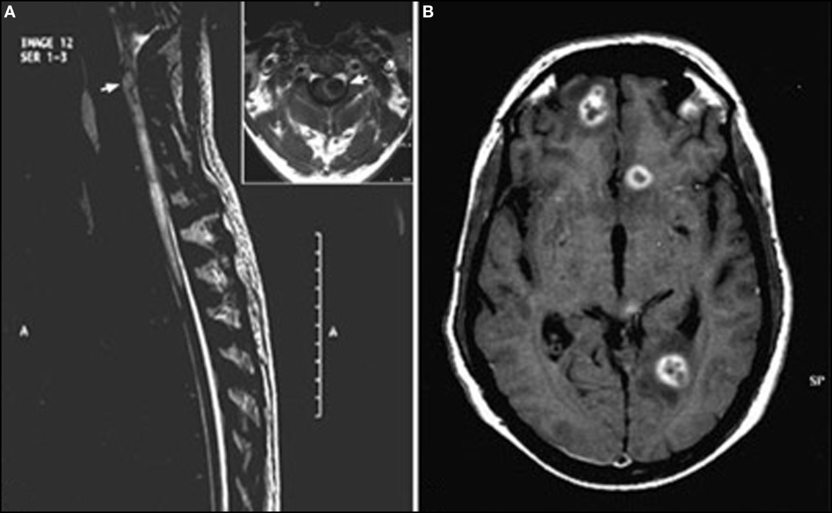 Encephalomyelitis (50) (A) T2-weighted sagittal image of spine showing a hyperintense lesion (arrow) with extensive perilesional edema in the upper cervical cord. Inset highlights large lesion (arrow) with peripheral hyperintense rim and perilesional edema causing expansion of cervical cord. (B) T1-weighted axial post-contrast image of brain shows multiple ring-enhancing lesions in bilateral frontoparietal deep white matter with nodular enhancement of the wall seen in left frontal lesion. This image has permissions for use.