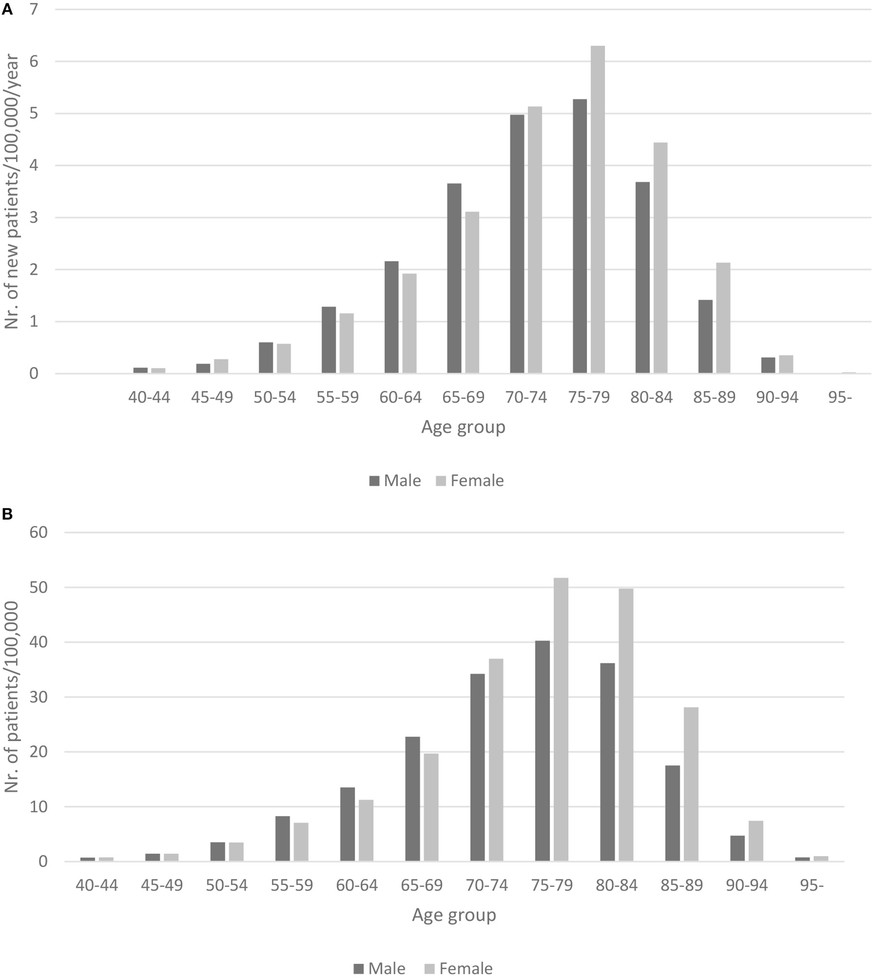(A) Crude incidence of PD in Hungary between 2010 and 2012 (per 100,000/year) by 5 year age categories and gender. (B) Crude prevalence of PD in Hungary between 2010 and 2012 (per 100,000) by 5 year age categories and gender.