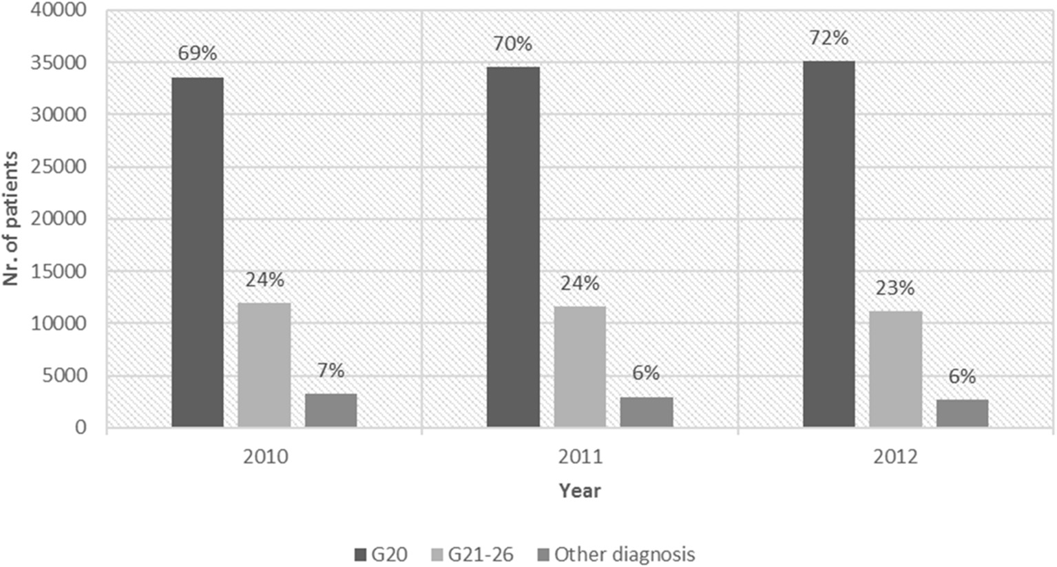 Out of the 10 million inhabitants of Hungary, 2.9 million people used at least once an inpatient or outpatient neurological service in the 10-year period of 2004–2013. During this time there were overall 96,874 patients admitted to hospitals or had outpatient visits at a neurological specialist care at least once with PD, ICD-10 code G20, as a primary or secondary diagnosis. Patients with parkinsonism (PKM, only G21–26 diagnoses without any appearance with G20) are not included in this number. Of the 96,874 patients with ICD-10 code G20, as a primary or secondary diagnosis, 60,039 patients were assigned only G20 diagnosis code, whereas 36,835 had at least one G21-26 diagnosis as well in addition to the G20 code over this 10-year period. During these 10 years 62,108 patients were registered with any of the G21-26 diagnoses without any appearance with G20 code.