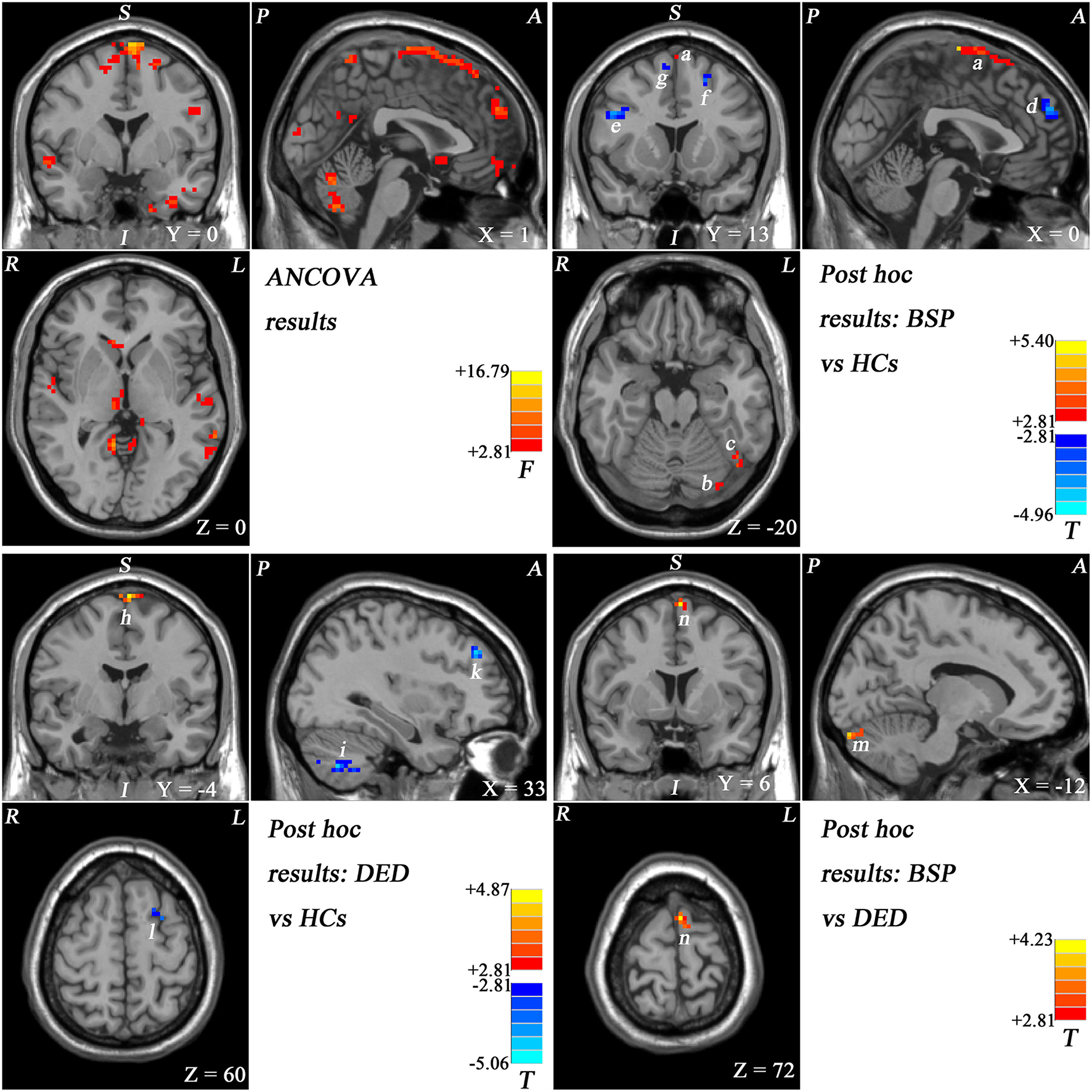 Statistical maps showing ALFF values differences in different brain regions across studied groups. Red and blue represent higher and lower ALFF, respectively. The color bars indicate the F-values from the ANOVA analyses and the T-values from post-hoc analysis between each pair of groups. (a) Bilateral SMA, (b) left cerebellar crus I, (c) left fusiform gyrus/cerebellar crus I, (d) bilateral superior MPFC, (e) right inferior frontal gyrus, (f) left middle frontal gyrus, (g) right superior frontal gyrus, (h) bilateral SMA, (i) right cerebellar VIII/VIIb, (k) right middle frontal gyrus, (l) left middle frontal gyrus, (m) left cerebellar crus I, and (n) left SMA.
