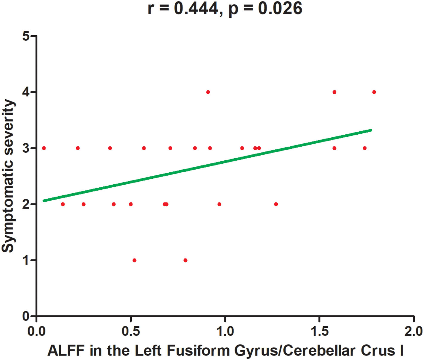 A significantly positive correlation was observed between ALFF values in the left fusiform gyrus/cerebellar Crus I and symptomatic severity (r = 0.444, p = 0.026) in patients with BSP by using a Spearman correlation analysis (Figure 2). No significant correlation was revealed between abnormal ALFF and other clinical variables of patients with BSP. No correlation between abnormal ALFF and clinical variables was observed in the subjects with DED.