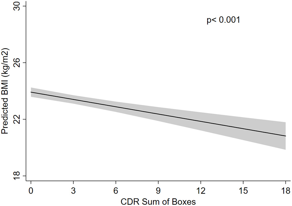 Predicted body mass index (BMI) according to Clinical Dementia Rating sum of boxes (CDR-SOB). Predicted BMI was calculated using a linear regression model adjusted for age, sex, race, education, hypertension, diabetes mellitus, heart failure, dyslipidemia, cancer, sedentary lifestyle, smoking, and alcohol use.