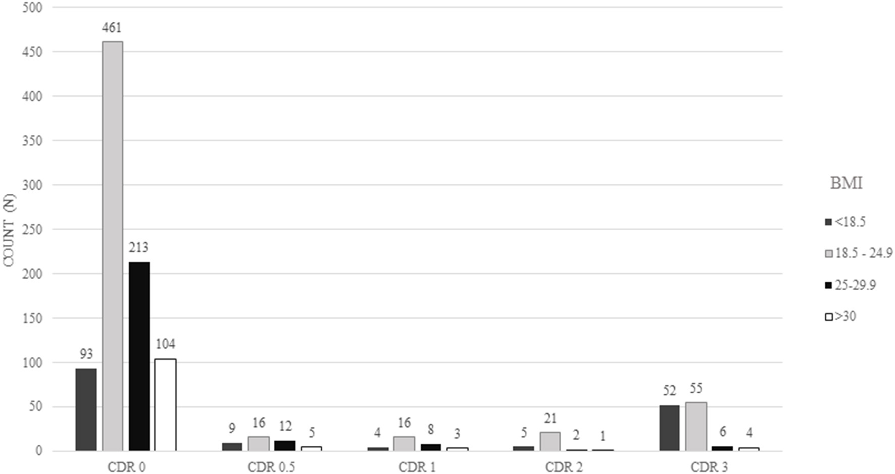 Absolute frequency of participants regarding the Clinical Dementia Rating (CDR) scores and body mass index (BMI) categories.