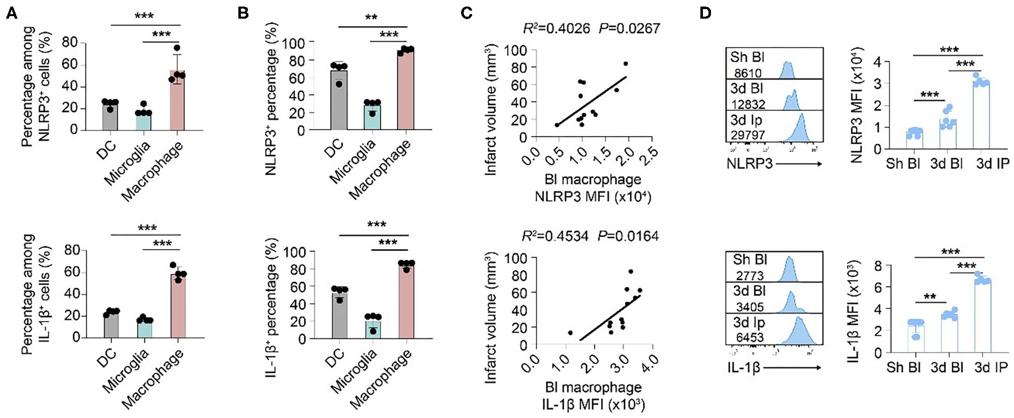 Inflammasomes activate primarily in macrophages that infiltrate into ischemic lesions after stroke. WT C57/Bl6 mice were subjected to Sham operation or tMCAO. Mice were sacrificed at 3 d after tMCAO when inflammasome activation peaked. (A) Brain cells that expressed NLRP3 and IL-1β were gated in flow cytometric analysis (FACS). Percentage in NLRP3+ or IL-1β+ cells of dendritic cells (DC, CD45+CD11c+), microglia (CD45intCD11b+), and macrophage (CD45hiCD11b+F4/80+) was assessed. N = 4 mice. ***P < 0.001 in One-way ANOVA. (B) Percentage of NLRP3 and IL-1β in dendritic cells (DC, CD45+CD11c+), microglia (CD45intCD11b+), and macrophage (CD45hiCD11b+F4/80+) in ipsilateral brain was calculated with flow cytometry. N = 4 mice. ***P < 0.001 in One-way ANOVA. (C) Mean fluorescent intensity (MFI) of NLRP3 or IL-1β in macrophages (CD45hiCD11b+F4/80+) in the peripheral blood of mice was calculated. Correlation of NLRP MFI or IL-1β MFI with infarct volume of mice at 3 d after stroke was analyzed with Linear regression. N = 10 mice. (D) NLRP MFI or IL-1β MFI in macrophage (CD45hiCD11b+F4/80+) in peripheral blood (Bl) of Sham (Sh) operated mice, peripheral blood of mice at 3 d after tMCAO and ipsilateral (Ip) brain was analyzed with flow cytometry. N = 4 mice. **P < 0.01, ***P < 0.001 in One-way ANOVA.