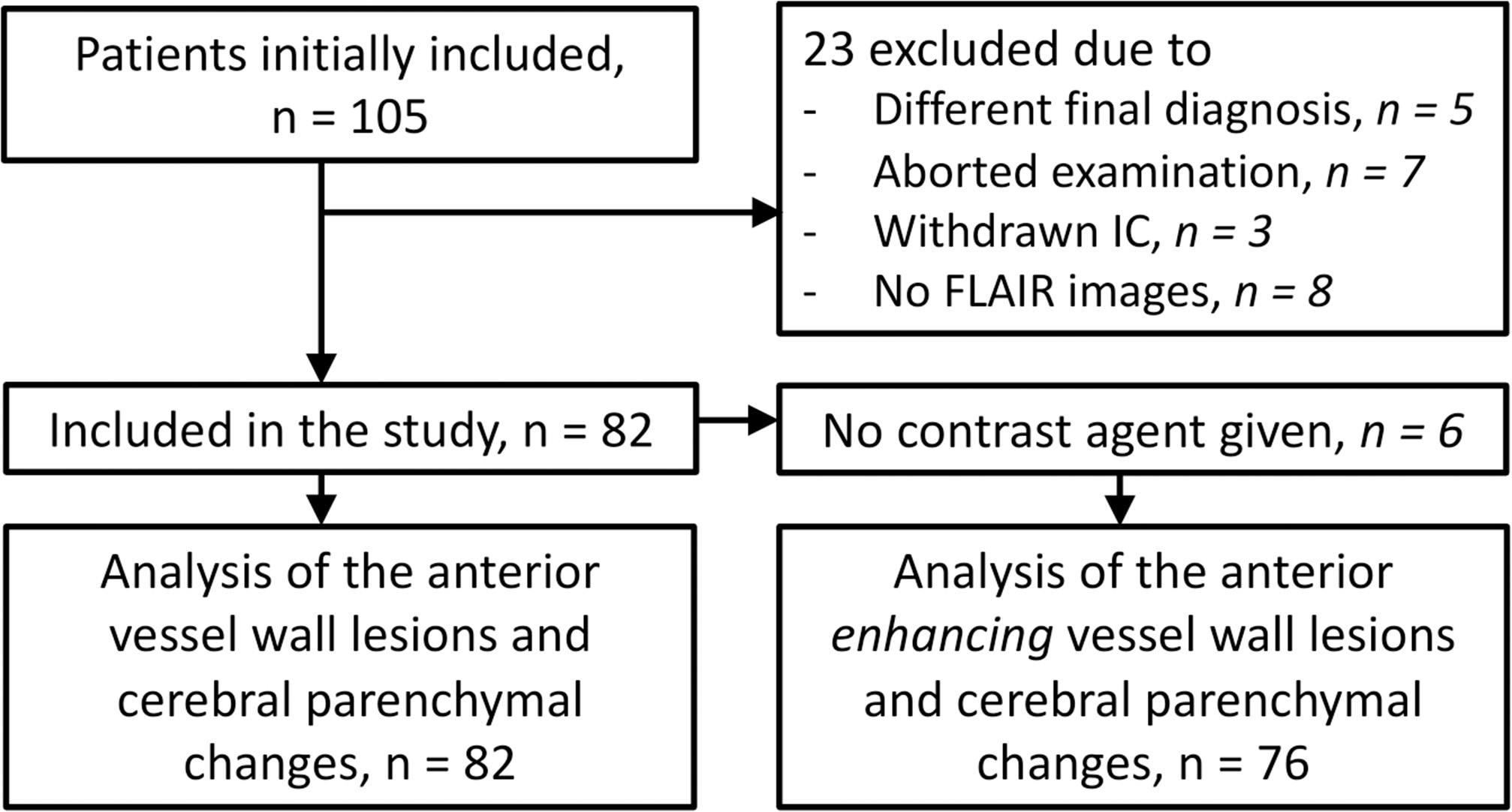 A total of 105 patients were included in the IVI study. Twenty-three patients were excluded because of reasons listed in Figure 1, leaving a total of 82 patients for the current study. Baseline characteristics of the study participants are shown in Table 1.