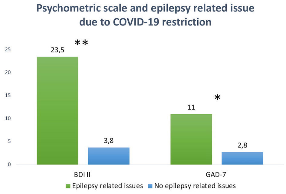 Significant differences in BDI II scale value (**p < 0.01) and GAD-7 value (*p < 0.05) between the group who experienced major epilepsy-related issues during the COVID-19 pandemic and the group who did not.