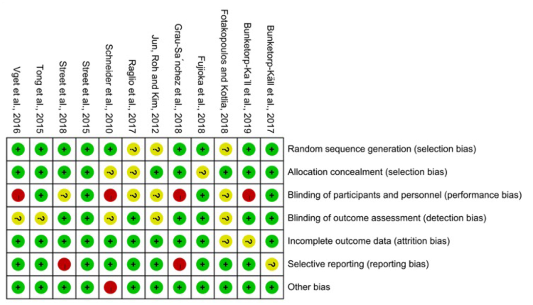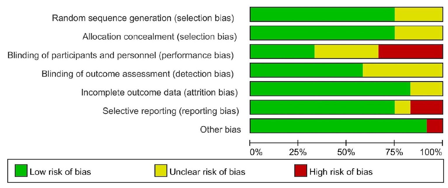 The risk of bias assessment was based on the handbook of Cochrane (5.1 version). To assess bias, two reviewers independently followed the steps to choose low risk and high risk; if a question was impossible to answer because the original article did not specify it or it was unclear, we chose “unclear.” Reviewers assessed selection (random sequence generation and allocation concealment), performance (blinding of participants and personnel), detection (blinding of outcome assessors), attrition (incomplete outcome data), reporting (selective reporting), and other sources of bias. If there is a disagreement between two reviewers, a third reviewer will solve it. See Figures 2, 3.
