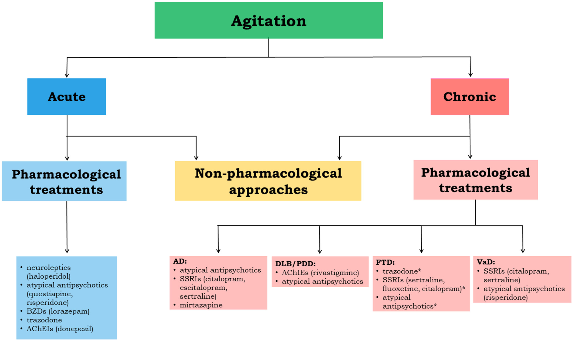 Figure 2. The flowchart depicts the therapeutical management flow to be implemented in acute and chronic agitation. The most relevant evidence-based drug options are reported for each neurodegenerative disease. *indicates not sufficiently supported by clinical evidence; AD, Alzheimer's disease; DLB, dementia with Lewy bodies; PDD, Parkinson's disease with dementia; VaD, vascular dementia; FTD, frontotemporal dementia; AChEIs, acetylcholinesterase inhibitors; BZDs, benzodiazepines; SSRIs, selective serotonin reuptake inhibitors.