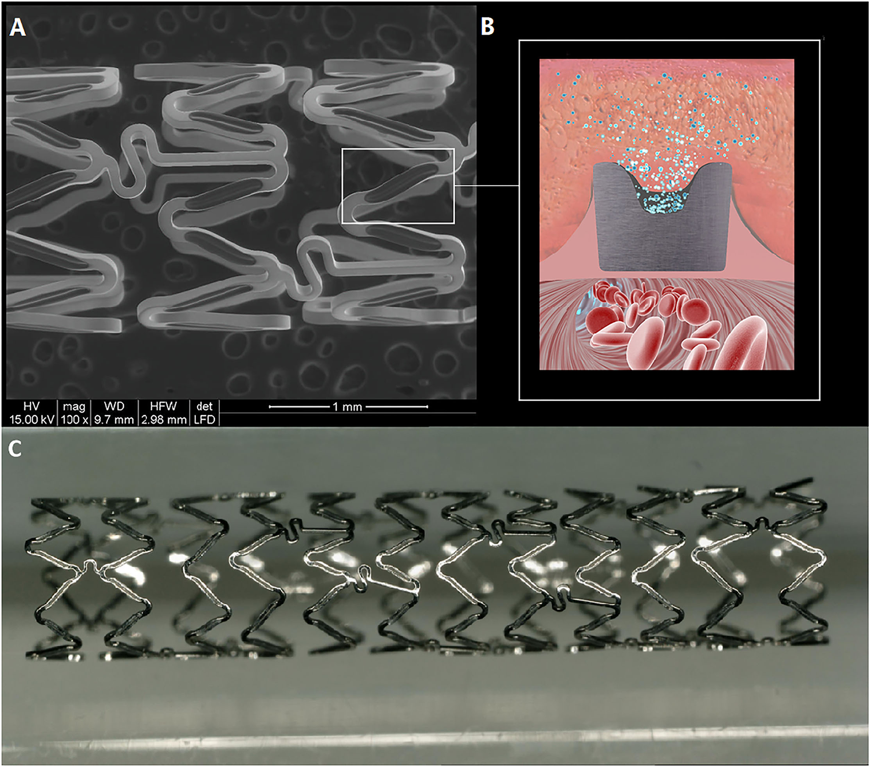 The Firehorus stent design. (A) The Firehorus stent is made of L605 cobalt chromium alloy; (B) Abluminal surface with recessed grooves containing D,L-polylactic acid biodegradable polymer, which provides controlled rapamycin (sirolimus) release; and (C) The Firehorus stent.