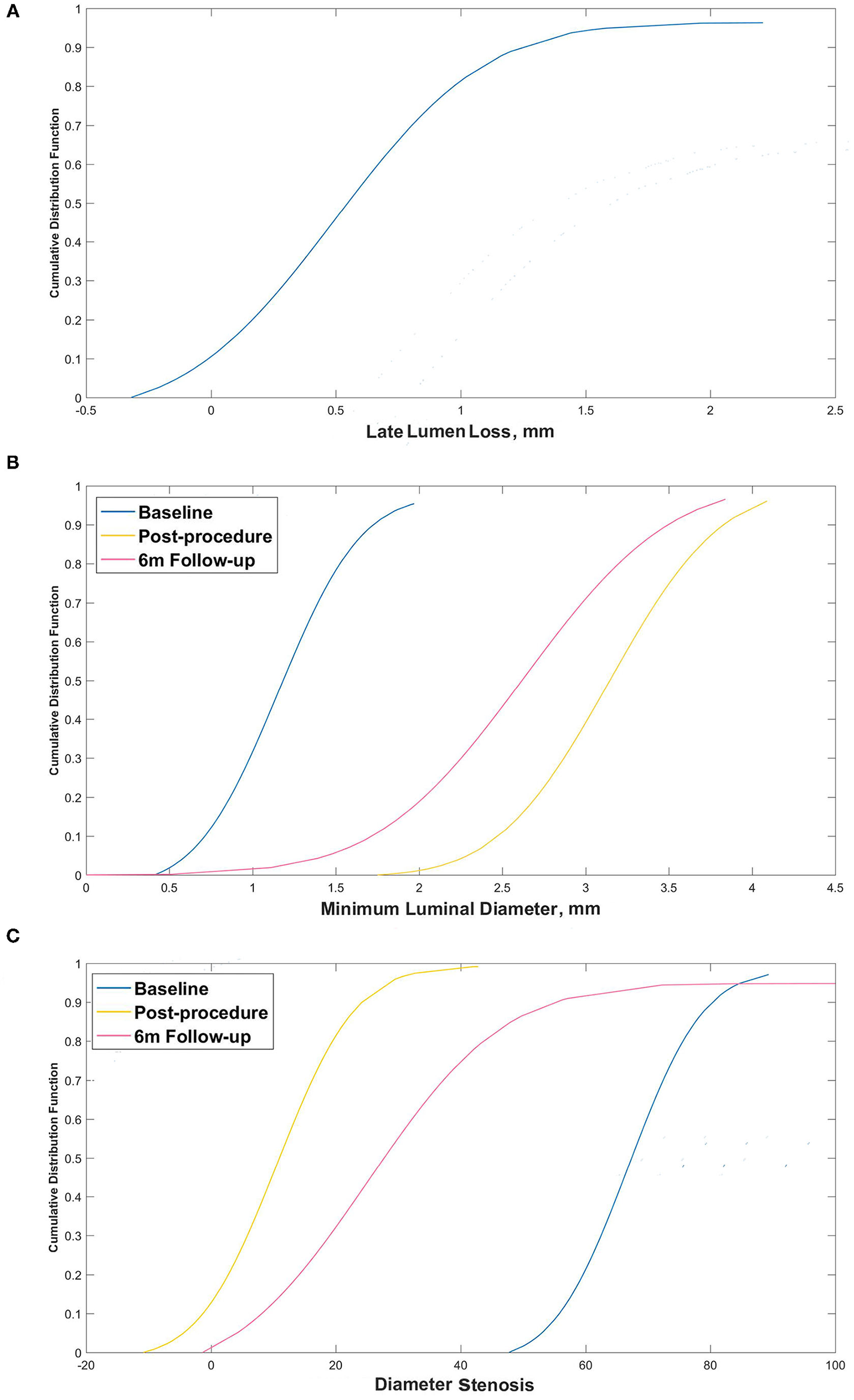 Cumulative frequency distribution curves. (A) Cumulative frequency distribution curve for late lumen loss at 6 months; (B) Minimum luminal diameter pre- and postprocedure and at the 6-month follow-up; and (C) Percentage diameter stenosis pre- and postprocedure and at the 6-month follow-up.