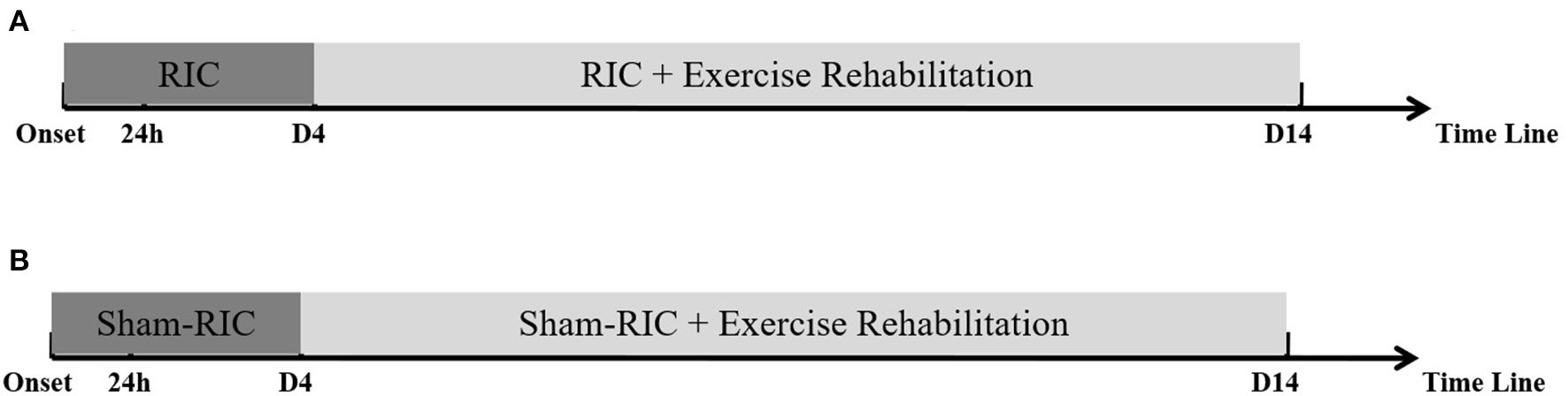 RIC is a non-invasive, feasible, and promising rehabilitative method for patients recovering from ischemic stroke. It has been demonstrated that post-stroke RIC training can be carried out safely within 6–24 h of acute ischemic stroke attack and induce a significant neuroprotective and neurorehabilitative effect (39). Hence, RIC training will be initiated within 24 h after stroke onset in this study.