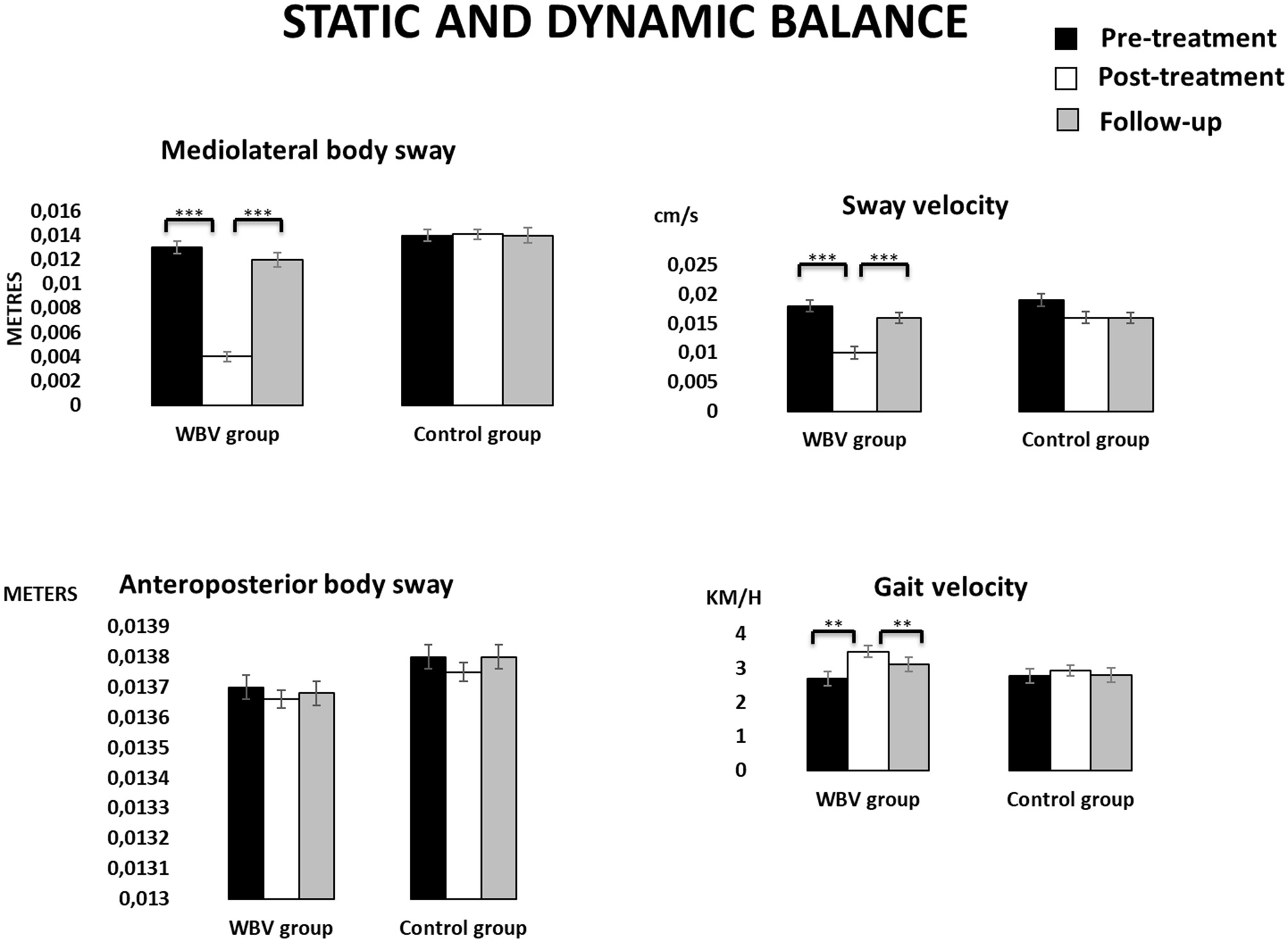Descriptive data (mean and TE) for the WBV group and the control group in static and dynamic balance at the three assessment times. ***p < 0.001, **p < 0.001.